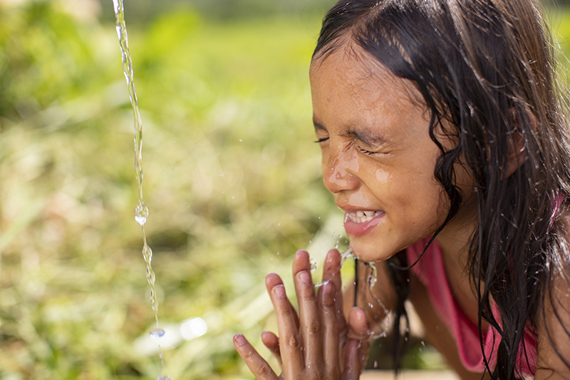 Barbie Joy, 8, washes her face and hands with clean water from a new water system built by ChildFund in Cagayan de Oro, Philippines. Before the new system was installed, people were drawing water from dirty rivers or irrigation canals that contained toxic chemicals, and children were getting sick often.