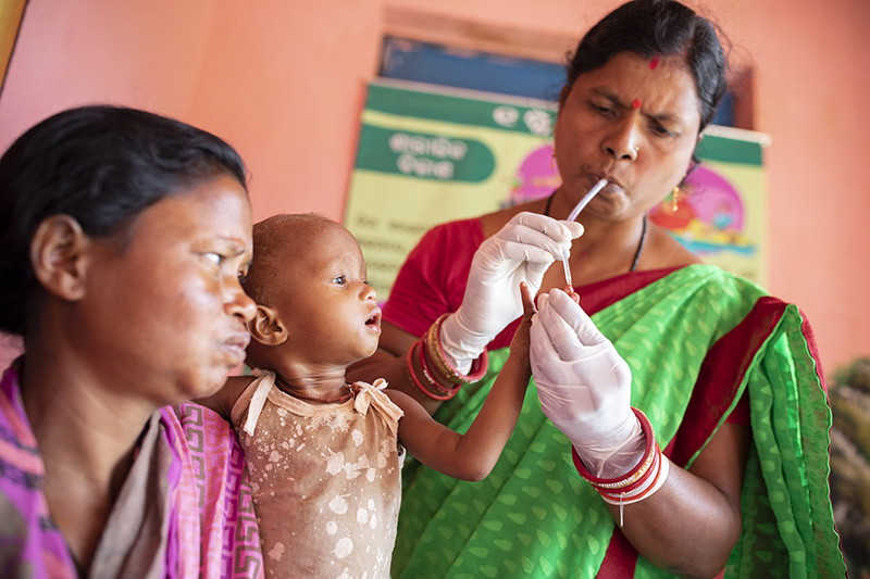 Mothers and young children are tested for anemia and malnutrition at a ChildFund-supported health clinic in Keonjhar District, India. Anemia stems from iron deficiency and often accompanies malnutrition in both children and adults.