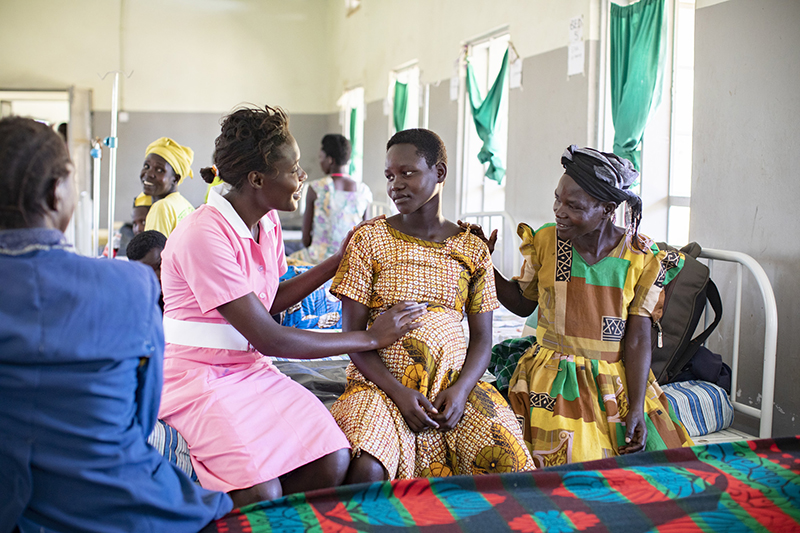 Former sponsored child Diana (left), who now works as a nurse, attends to a laboring patient at a ChildFund-supported maternity center in Kapelebyong District, Uganda. Maternal health care is critical to ensuring that a child gets a healthy start in life.